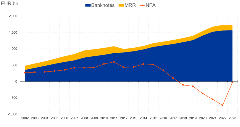 2023. gada 29. decembrī Eurosistēmas neto finanšu aktīvi bija –28 mljrd. euro. Iepriekšējos gados Eurosistēmas neto finanšu aktīvi nepārtraukti samazinājās galvenokārt tāpēc, ka palielinājās bilances pasīvu puse, kas ar uzviju kompensēja attiecīgās pozitīvās norises aktīvu pusē, kā paskaidrots iepriekš. 2023. gadā šī tendence mainījās, Eurosistēmas neto finanšu aktīviem gada laikā palielinoties. Tas lielā mērā skaidrojams ar būtisku bilances pasīvu puses sarukumu. To galvenokārt noteica ar monetāro politiku nesaistīto noguldījumu atlikuma samazināšanās, un Padome pēdējos gados vairākkārt koriģēja atlīdzību par šādiem noguldījumiem, t. sk. 2022. gada septembrī un 2023. gada februārī.