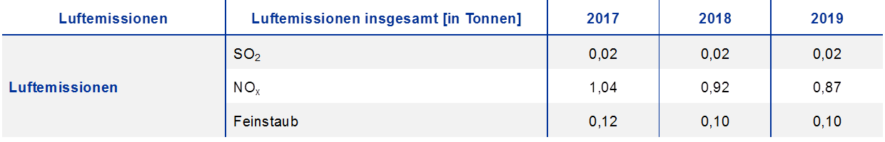 Neben den oben dargestellten Emissionen werden auch die Ausstoßmengen von Schwefeldioxid (SO2), Stickoxid (NOx) und Feinstaub überwacht und ausgewiesen. Diese Emissionen fallen bei der Nutzung der EZB-eigenen Fahrzeuge, bei Testläufen der Notstromaggregate und beim Verbrauch von Erdgas direkt an. Die jeweiligen Emissionswerte finden sich in Kapitel 6 – Technische Informationen.