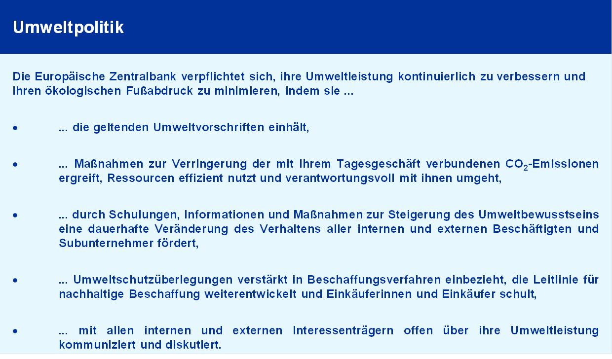 In ihrer Umweltpolitik legt die EZB ihre grundsätzlichen Absichten und Ausrichtungen in Bezug auf ihre Umweltleistung und ihre Umweltziele dar. In der englischen Fassung der Umweltpolitik 2019 der EZB wurde eine redaktionelle Änderung vorgenommen. Diese Änderung steht im Einklang mit der jüngsten Aktualisierung der EMAS-Verordnung und des ISO-Standards 14001 und den darin verwendeten Begrifflichkeiten. Die Formulierung, die sich auf die Selbstverpflichtung der EZB bezieht, ihre Umweltleistung kontinuierlich zu verbessern, wurde von „continuous environmental improvement“ in „continual environmental improvement“ geändert. Dadurch wird der zyklische Charakter des Umweltmanagementsystems hervorgehoben.