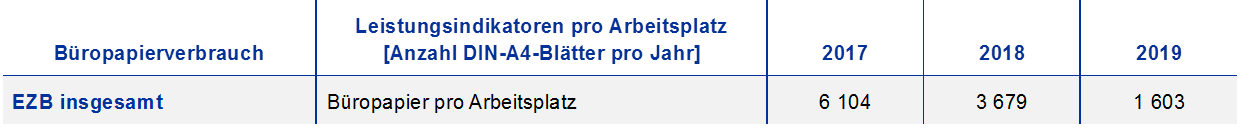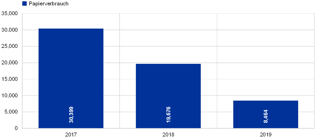 Der Rückgang des Büropapierverbrauchs ist darauf zurückzuführen, dass die Digitalisierung von Prozessen stark vorangetrieben und erleichtert wird. So werden beispielsweise öffentliche Beschaffungsverfahren digital abgewickelt. 2019 wurde eine Anwendung eingeführt, mit der EZB-Mitarbeiterinnen und -Mitarbeiter per Fernzugang über ihre Firmenmobiltelefone flexibel auf Sitzungsunterlagen zugreifen können. Die stetige Abnahme des Büropapierverbrauchs belegt auch, dass Umweltkampagnen wie „Plants for Printers“ Früchte tragen und das Bewusstsein der Belegschaft für einen effizienten und sorgsamen Umgang mit Ressourcen schärfen.