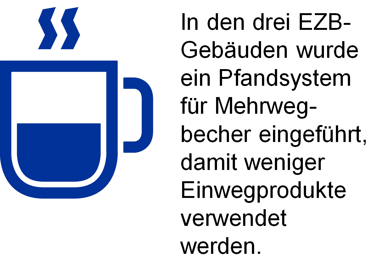2019 wurde eine Reihe weiterer Aktionen durchgeführt, die dazu beitrugen, die Materialeffizienz im Arbeitsalltag der EZB zu steigern. Eine nennenswerte Neuerung ist die Abschaffung von Einwegbechern in allen Gebäuden. Stattdessen wurde ein Pfandsystem mit Mehrwegbechern für „To-Go“-Getränke eingeführt. Durch das Pfandsystem konnten Einwegartikel in großem Stil reduziert werden, und die Belegschaft kann die Mehrwegbecher auch in den teilnehmenden Coffee Shops nutzen.