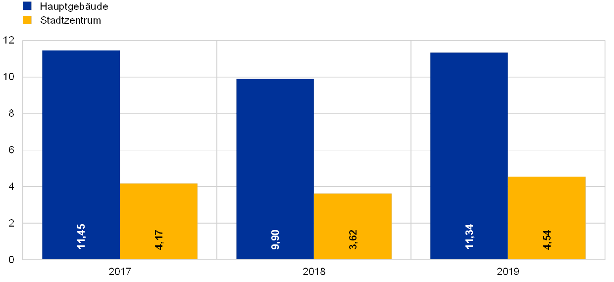 Die im Stadtzentrum gelegenen EZB-Gebäude wurden vor 2018 modernisiert und daher unterschiedlich lange und in unterschiedlich starker Auslastung genutzt. Dies schlug sich auch im schwankenden Energieverbrauch nieder. Der Stromverbrauch der im Stadtzentrum gelegenen EZB-Gebäude erreichte 2018 aufgrund der erstmaligen Vollauslastung des Japan Centers durch die EZB einen Höchstwert. 2019 verringerte sich der Stromverbrauch von Eurotower und Japan Center dann um 3,7 %. Der Verbrauch an Heiz- und Kühlenergie ging 2019 im Vorjahresvergleich um 8,2 % zurück. Dies ist vor allem dem Abschluss von Umbaumaßnahmen zuzuschreiben, die 2018 begonnen hatten und dank derer der Energieverbrauch auf normalen Regelbetrieb eingestellt werden kann. Das technische Umfeld, in dem die Blockheizkraftwerke betrieben werden, dämpfte die Menge des 2019 erzeugten Stroms weiter. Maßnahmen zur Bewertung der Lage wurden eingeleitet. Obwohl weniger Strom produziert wurde, schrumpfte der Anteil des zugekauften Stroms um 1,8 %.