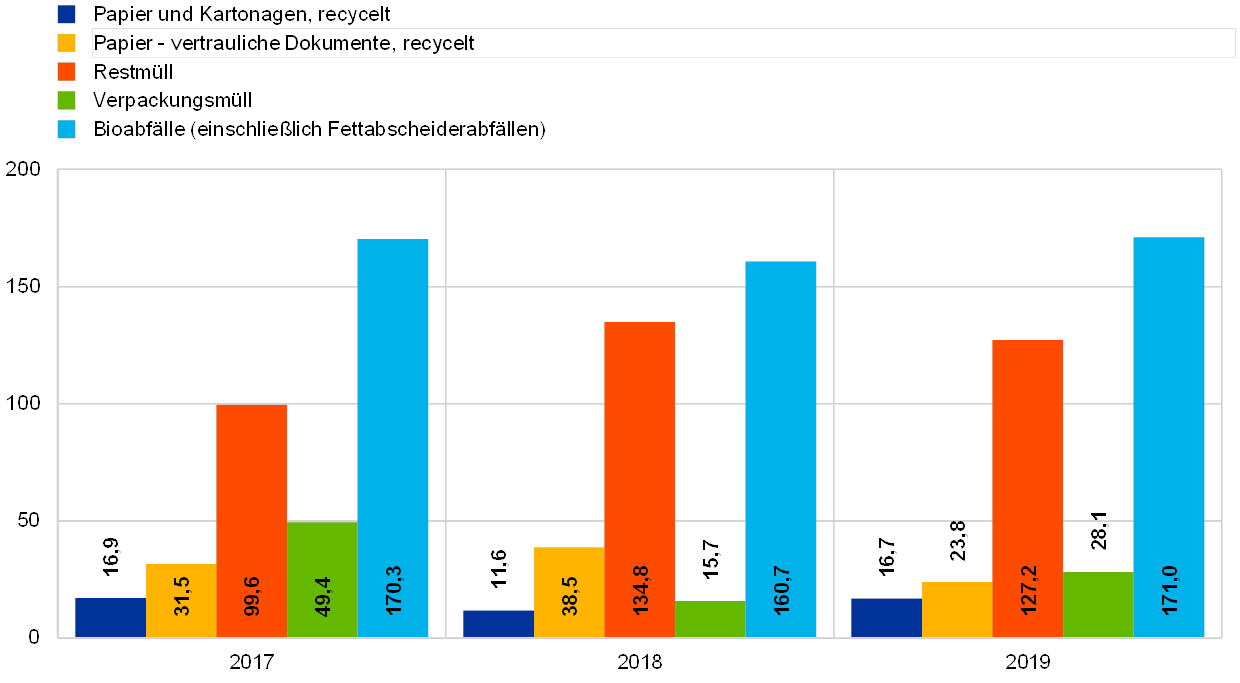 Anmerkung: * Die Zahlen für den Wasserverbrauch für sonstige Zwecke und für Bioabfälle im Jahr 2018 wurden nachträglich korrigiert. Daher deckt sich der ausgewiesene Rückgang möglicherweise nicht mit den Werten, die in der EZB-Umwelterklärung 2019 angegeben sind. Die berichtigten Zahlen und weitere Angaben finden sich in Kapitel 3.3 – Wasser und Abwasser, Kapitel 3.4 – Abfall und Recycling und Kapitel 6 – Technische Informationen.
