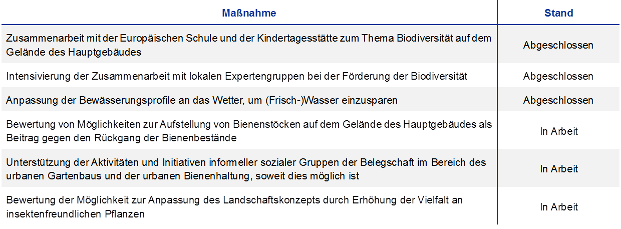 Die EZB prüft noch, ob Bienenstöcke, weitere Insektenhotels sowie zusätzliche Vogelnist- und Fledermauskästen aufgestellt werden können. An Umwelt- und Nachhaltigkeitsthemen interessierte EZB-Mitarbeiter haben aus eigener Initiative die Ecology Group gegründet. In Zusammenarbeit mit dieser Gruppe werden fortlaufend Möglichkeiten zur Förderung der Biodiversität geprüft und vorangebracht.