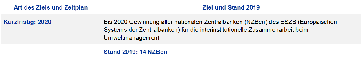 Das EMAS sieht Prüfungen im Dreijahresturnus vor, d.h. der aktuelle EMS-Zyklus der EZB würde von 2019 bis 2022 laufen. Um ihr Umweltmanagementsystem auf ihren strategischen Geschäftszyklus abzustimmen, erwägt die EZB derzeit, die Prüfung ein Jahr vorzuziehen. Es ist daher denkbar, dass die EZB die nächste konsolidierte Umwelterklärung ein Jahr früher als ursprünglich geplant erstellt und veröffentlicht, sodass der neue EMAS-Zyklus 2021 beginnt. Bei der vorliegenden Umwelterklärung handelt es sich um die planmäßige Aktualisierung der EZB-Umwelterklärung 2019.