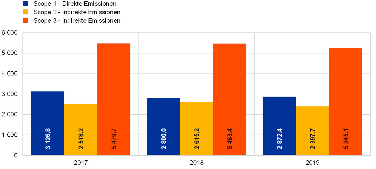 Scope-3-Emissionen sind Emissionen aus Dienstreisen, dem Arbeitsweg der Belegschaft und dem Papierverbrauch (in den Büros und für die externe Kommunikation). Zusammen machen diese Emissionen etwa die Hälfte der ausgewiesenen CO2-Gesamtemissionen der EZB aus.