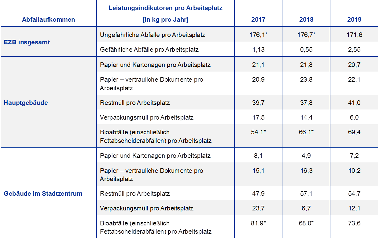 Anmerkung: * Die Bioabfallmenge für 2017 und 2018 wurden aufgrund einer Verbesserung im Kontroll- und Meldeprozess korrigiert. Die Abfallmenge im Hauptgebäude wurde für 2017 von 44,1 kg in 54,1 kg und für 2018 von 48,1 kg in 66,1 kg berichtigt. Die Abfallmenge in den Gebäuden im Stadtzentrum wurde für 2017 von 63,5 kg in 81,9 kg und für 2018 von 51,6 kg in 68,0 kg berichtigt. Die Menge an ungefährlichen Abfällen pro Arbeitsplatz wurde daher für 2017 von 162,6 kg in 176,1 kg und für 2018 von 159,4 kg in 176,7 kg geändert.