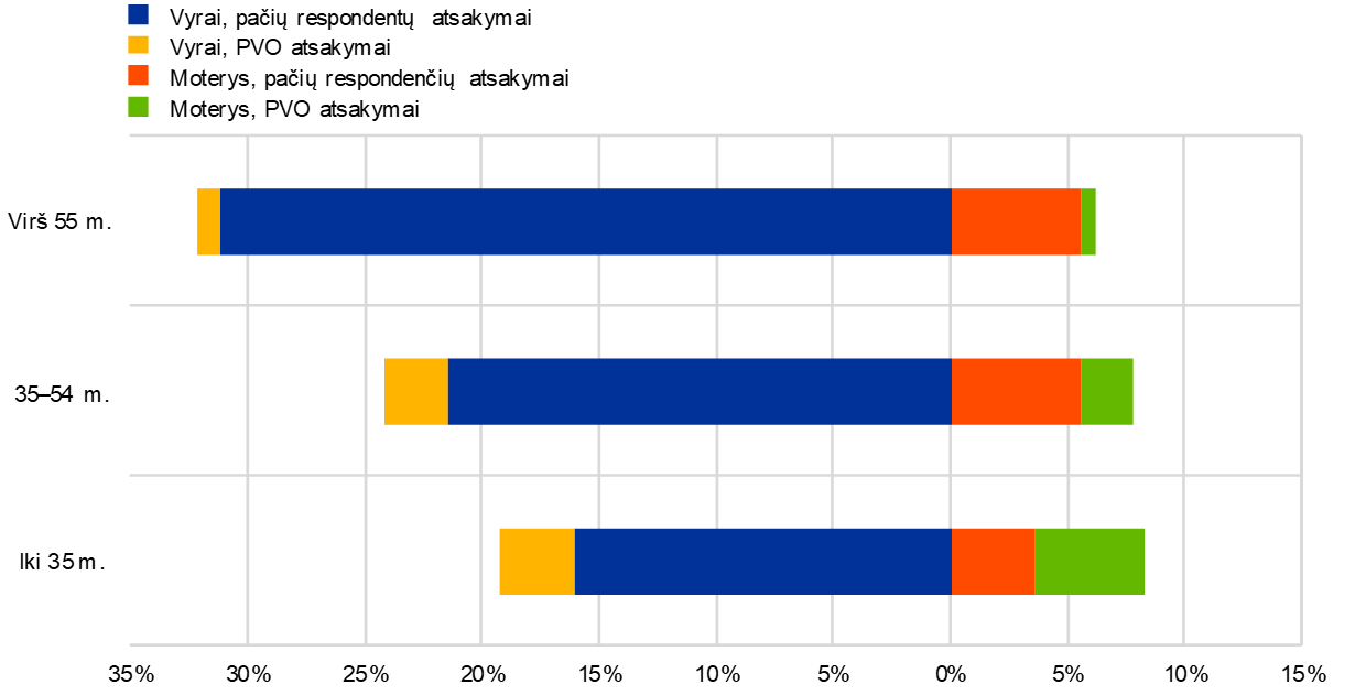 Dėl socialinių ir demografinių grupių pažymėtina, kad tarp vyrų ir moterų atsakymų didelių skirtumų nepastebėta (žr. 15 pav. c pjūvį), o jaunesni respondentai į klausimus neatsakė dažniau negu vyresni (žr. 15 pav. d pjūvį).