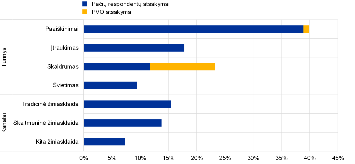 Daugelis respondentų daugiausia dėmesio skyrė žiniasklaidos kanalams, per kuriuos gauna informaciją apie ECB, o kai kurie respondentai pažymėjo, kad norėtų gauti informaciją iš centrinio banko tiesiogiai. Tačiau, kaip ir tikėtasi, kai kurie respondentai kaltino nacionalinę žiniasklaidą dėl to, kad pinigų politika ir ES problemos nušviečiamos nepakankamai arba kad informacija iškraipoma.