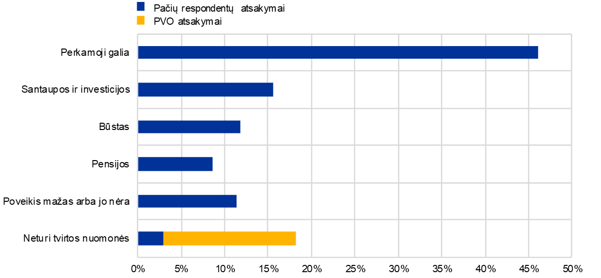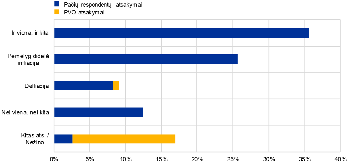 - Atsakymuose dėl pernelyg didelės infliacijos ir (arba) defliacijos didžiausia dalis respondentų pažymėjo, kad jiems susirūpinimą kelia ir viena, ir kita, ir pabrėžė kainų stabilumo svarbą. Vien infliaciją kaip nerimą keliantį veiksnį nurodė antra pagal dydį respondentų dalis.