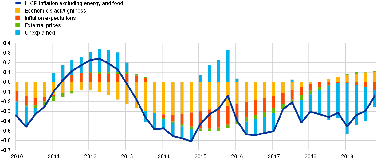 16. See Bobeica, E. and Sokol, A., “Drivers of underlying inflation in the euro area over time: a Phillips curve perspective”, Economic Bulletin, Issue 4, ECB, 2019. This analysis focuses on an in-sample decomposition of inflation. For a recent analysis of the forecasting performance of this type of model, as well as of the predictive power of different types of variables for inflation, see Moretti, L., Onorante, L. and Zakipour Saber, S., “Phillips curves in the euro area”, Working Paper Series, No 2295, ECB, July 2019.