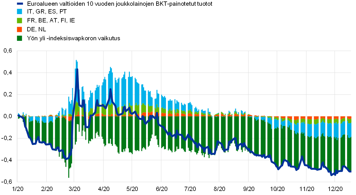 Kokonaisinflaatio euroalueella hidastui keskimäärin 0,3 prosenttiin vuonna 2020 edellisvuoden 1,2 prosentista. Yhdenmukaistetun kuluttajahintaindeksin (YKHI) erien tarkastelu osoittaa, että kokonaisinflaation hidastuminen johtui pääasiassa energian hintainflaation vaimenemisesta mutta vuoden jälkipuoliskolla myös ilman energiaa ja elintarvikkeita lasketun YKHI-inflaation vaimenemisesta (ks. kuvio 9). Inflaation hidastuminen johtui pohjimmiltaan taloudellisen toiminnan äkillisestä supistumisesta, joka heikensi merkittävästi kuluttajakysyntää ja aiheutti talousnäkymiin vakavaa talouskasvun hidastumisen riskiä. Inflaation hidastumispaineet kuvastivat myös eräitä koronapandemian ja sen torjuntatoimien taloudellisia vaikutuksia. Esimerkiksi inflaation hidastuminen edelleen vuoden jälkipuoliskolla johtui osittain kriisistä pahimmin kärsivien, matkailuun liittyvien palvelujen (erityisesti kuljetus ja hotellit) hintakehityksen heikkenemisestä sekä Saksan arvonlisäverokannan tilapäisen alennuksen vaikutuksesta.