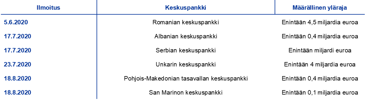 - Ks. ”ECB Banking Supervision provides temporary capital and operational relief in reaction to coronavirus”, EKP:n pankkivalvonnan lehdistötiedote, 20.3.2020.