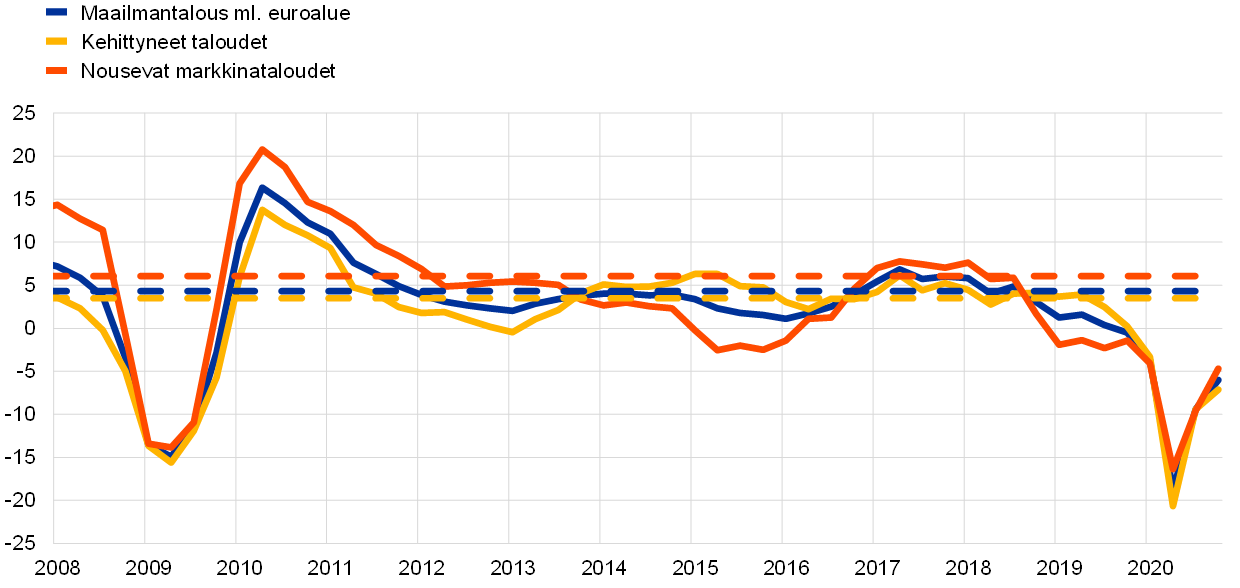 Vuoden 2020 lopussa covid-19-rokotteiden liittyvän myönteisen kehityksen valossa maailmanlaajuisen kasvun arvioitiin elpyvän voimakkaasti vuonna 2021. Näkymät olivat kuitenkin hyvin epävarmoja, ja maailmantalouden kasvuun kohdistuvat riskit kallistuivat kaiken kaikkiaan huonompaan suuntaan, koska uusien tartuntojen voimakas lisääntyminen ja keskeisissä talouksissa aloitetut uudet rajoitustoimet jarruttivat talouden elpymisvauhtia.[1]