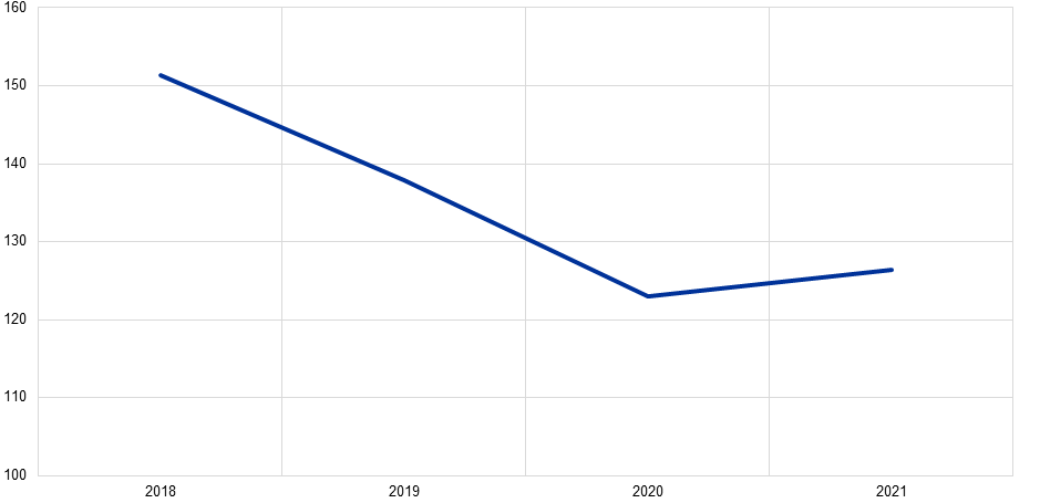 The updated version we have just published now allows the data to be analysed as consistent time series. As can be seen in Chart 2, direct emissions financed via euro area bank loans generally show a downward movement between 2018 and 2020. The indicator increased slightly in 2021, the latest year that source data are available for. This uptick might be a result of increased economic activity as pandemic restrictions loosened.