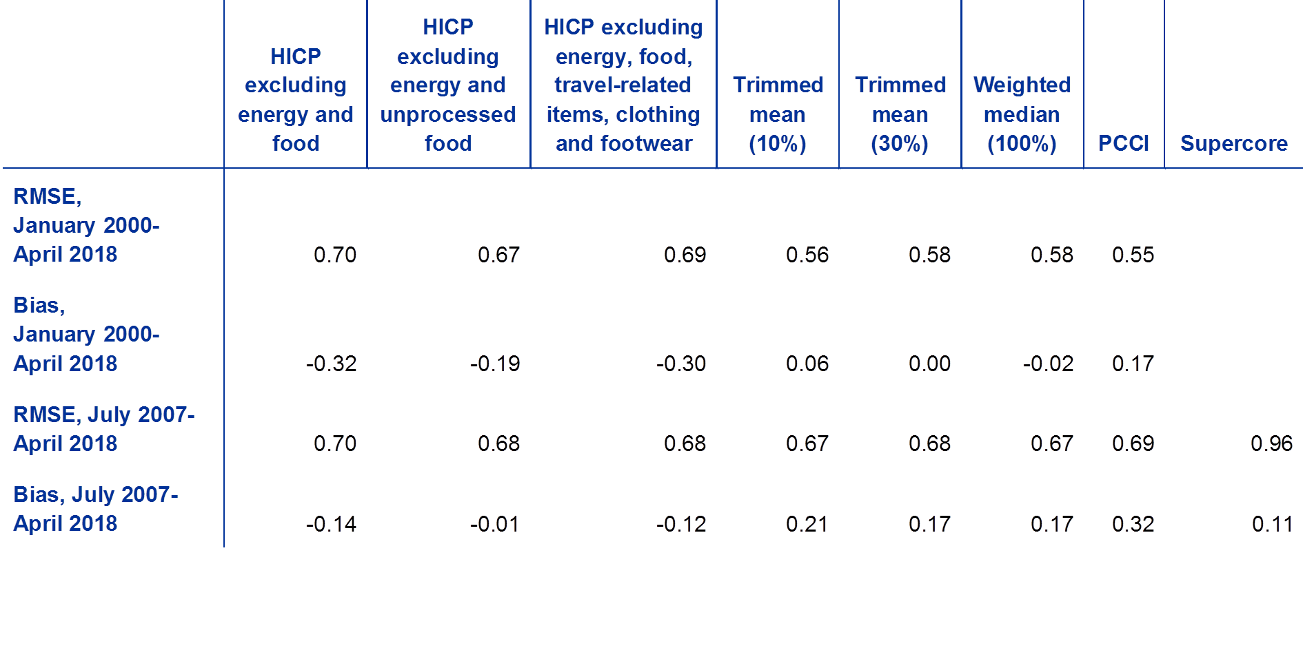 Notes: All measures of underlying inflation are computed in “real time”, i.e. by considering only the information that would be available to the forecaster at time t. See also the notes to Table 2. For example, in the case of Supercore, real-time vintages of the output gap are used.