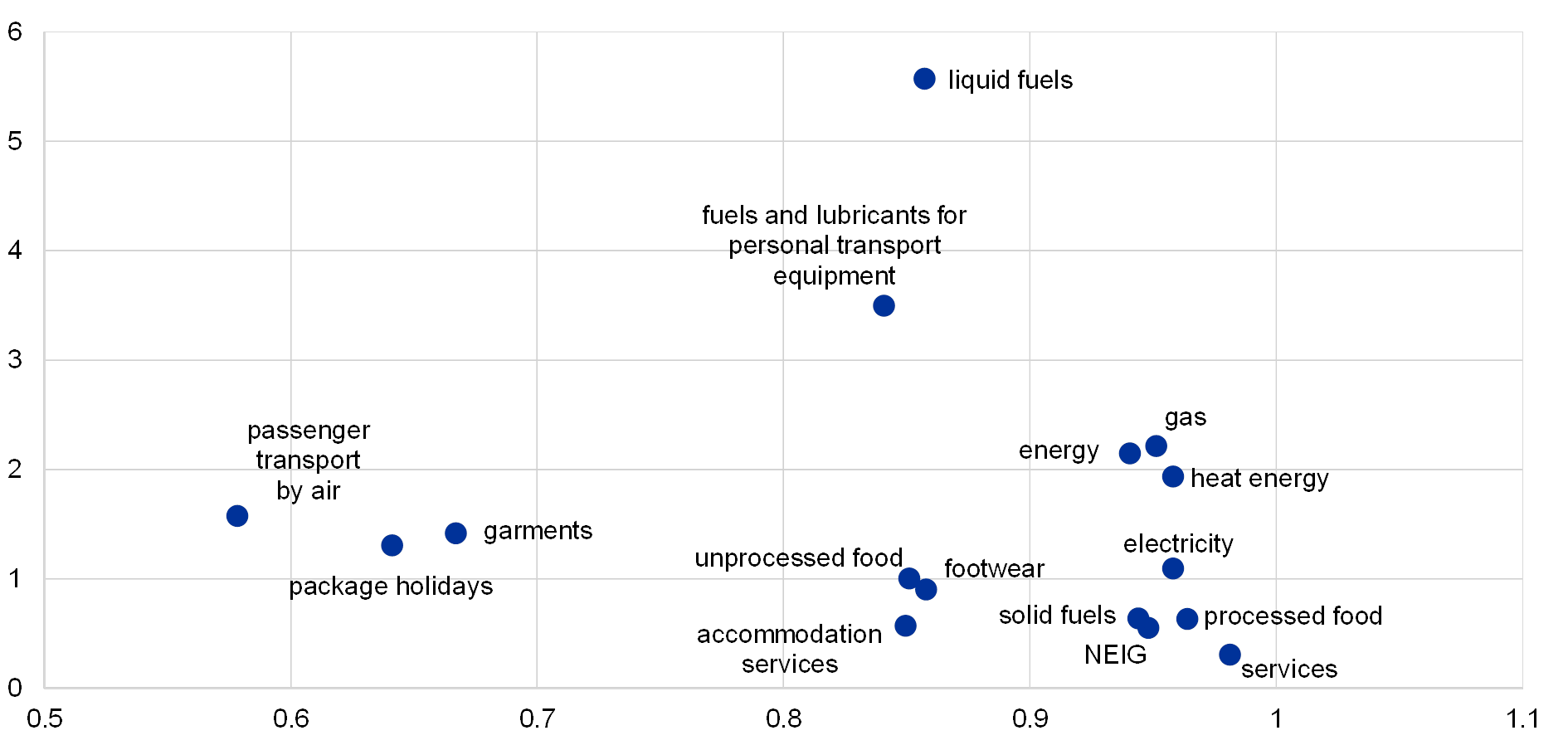 The sub-components that exhibit high volatility also tend to be those that are less persistent. The implicit assumption underlying standard exclusion-based measures is that minimising volatility will help to isolate the more persistent movements in inflation. However, high volatility and low persistence do not necessarily go hand in hand.[12] A cross-check of volatility against some standard metrics of persistence generally supports the assumption that the excluded sub-components are also characterised by lower persistence (see Chart 2).[13] For example, large sub-components of energy inflation, such as fuels for transport equipment, are highly volatile and less persistent. Unprocessed food inflation also tends to be relatively less persistent. Inflation for air fares, package holidays and garments is somewhat more volatile but also clearly less persistent, supporting the exclusion of such items from a measure of underlying inflation. However, for other items, such as accommodation services and processed food, the case for exclusion is less clear-cut while, as expected, services inflation is overall smooth and highly persistent.[14]