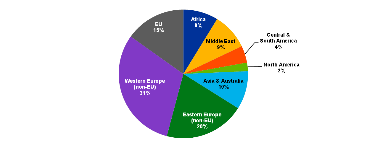 Charts C and D indicate that, in 2017, around two-thirds of the value of all euro banknote shipments of wholesale banks related to purchase and sale transactions with European countries, including Russia and Turkey. On the sales side (see Chart C) exports to Switzerland, which is included in western Europe (non-EU), dominated, accounting for 28% of all euro banknote sales in 2017. Euro banknotes are dispensed by many ATMs in Switzerland and used for shopping in the surrounding euro area countries. 20% of all sales went to eastern Europe (non-EU), mostly to Russia, where euro banknotes serve predominantly as a store of value. The EU, in this case primarily the United Kingdom, accounted for 15% of all sales. That demand can be linked to tourism, in the form of British residents withdrawing euro banknotes before going abroad. On the purchase side (see Chart D), eastern non-EU countries, especially Turkey, predominated in 2017 and accounted for 30% of all banknote purchases. These euro banknotes were either carried to Turkey by Turkish workers in the euro area (remittances) or by tourists. Similarly, the high share of purchases from EU countries (28%) can be explained by remittances.