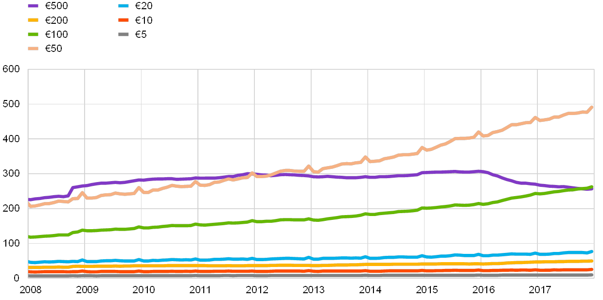 The Governing Council decision on the €500 – On 4 May 2016 the Governing Council decided to discontinue production of the €500 banknote with immediate effect and to stop its issuance around the end of 2018. The circulation of €500 banknotes has continuously declined since the first discussions on the topic were reported in the media in February 2016, although this decline has levelled off since April 2017. At the end of 2017 the value of €500 banknotes in circulation amounted to €256.8 billion, compared to €306.8 billion at the end of 2015. At the same time, the demand for €200, €100 and €50 denominations increased more than in previous years. This increase to a large extent offset the decline in €500 circulation. On average, from February 2016 to December 2017 annual circulation growth was 4.4%.