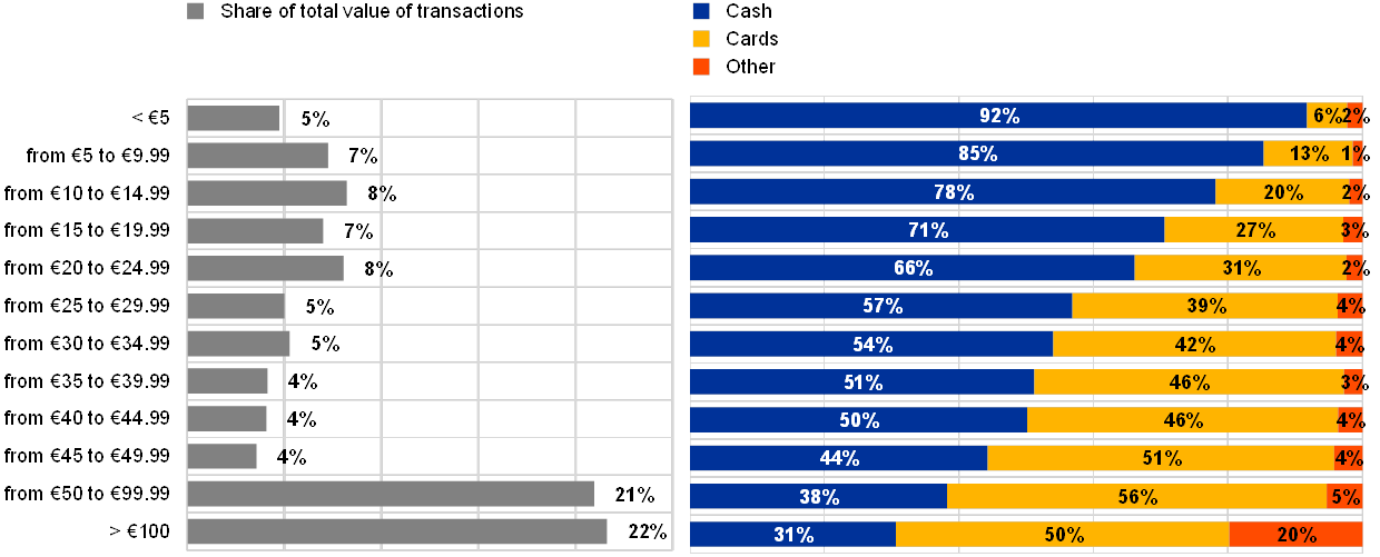 Higher-value transactions are mainly carried out using payment cards, but more than one-third of POS transactions involving amounts greater than €100 are still made in cash. Nevertheless, in line with the other findings of the study, there are large differences across the euro area in the use of cash for payments, including for amounts greater than €100. Chart B shows that in seven euro area countries more than 50% of POS payments, in terms of value, were in cash, while in other countries such as France and Belgium the share of high-value transactions using cash was relatively minor.