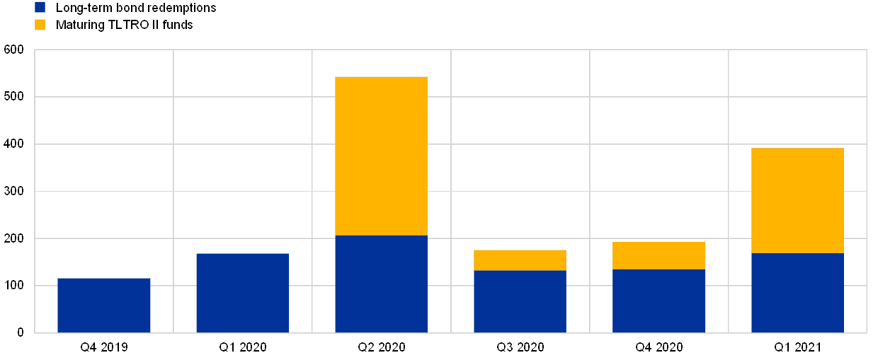 Notes: Long-term bond redemptions include bonds with an original maturity of more than a year, obtained from the CSDB statistics extracted as of October 2019. Hybrid bonds, certificates and Genussscheine are not considered in the calculation. Maturing TLTRO II funds refer to outstanding TLTRO II volumes (as of September 2019). TLTRO II.1, TLTRO II.2, TLTRO II.3 and TLTRO II.4 mature in June 2020, September 2020, December 2020 and March 2021 respectively.