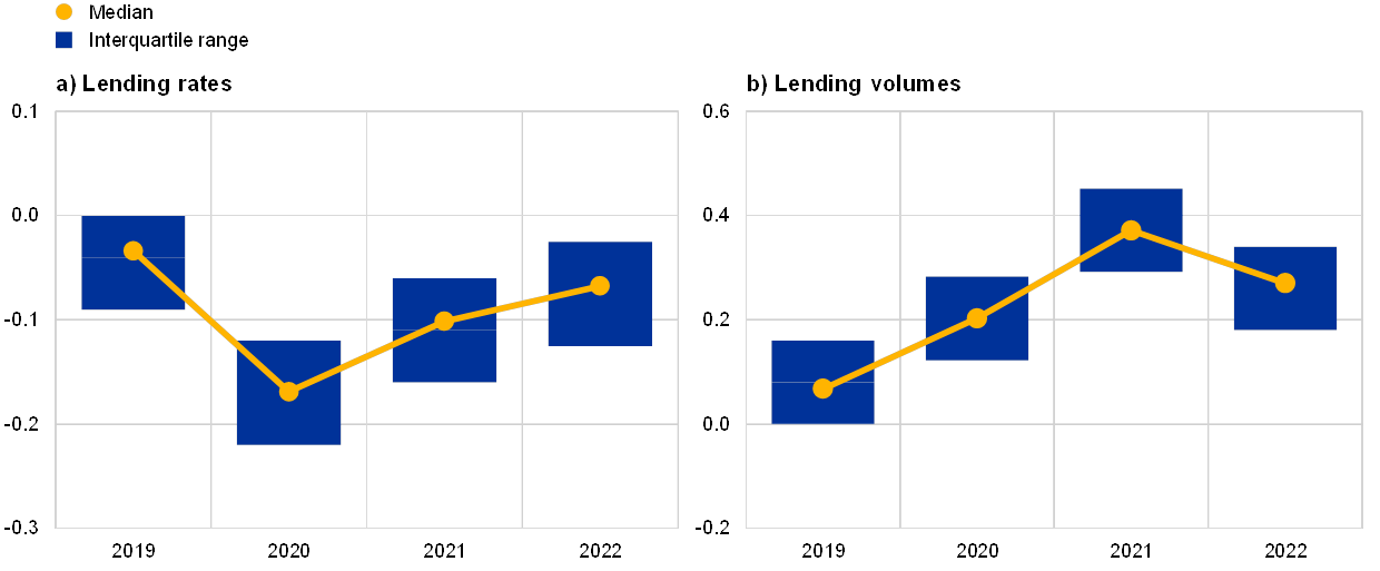 Credit markets have benefited from multiple and complementary monetary policy measures pursued by the ECB since 2014. The ECB has adopted a number of non-standard monetary policy measures since the summer of 2014. This includes launching targeted longer-term refinancing operations (TLTROs), lowering the deposit facility rate (DFR) into negative territory and expanding the asset purchase programme (APP) to target a variety of investment-grade private and public sector securities. These policies have also been underpinned by forward guidance on the key ECB interest rates and, more recently, the reinvestment horizon for the APP portfolio and the resumption of the APP. The ECB’s measures have stimulated the euro area economy via a number of transmission channels, leading to a significant upward impact on both real GDP and HICP inflation.[19] The transmission of these measures has operated in part through credit markets, including the direct pass-through channel and the bank lending channel.[20] Overall, these monetary policies have supported both the demand for, and the supply of, bank lending to corporates by improving the macroeconomic outlook and helping to mitigate banking sector constraints. This assessment is supported by analyses based on macroeconomic models, survey-based evidence and empirical studies based on micro data.