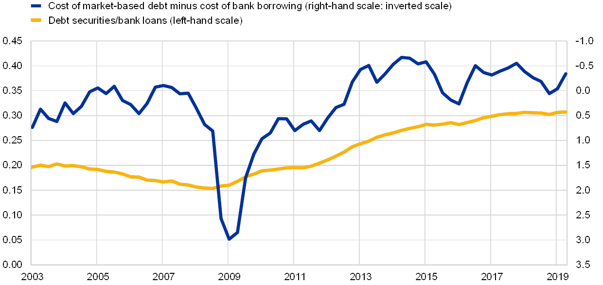 Ratio of debt securities issuance to bank loans and relative cost of market-based debt