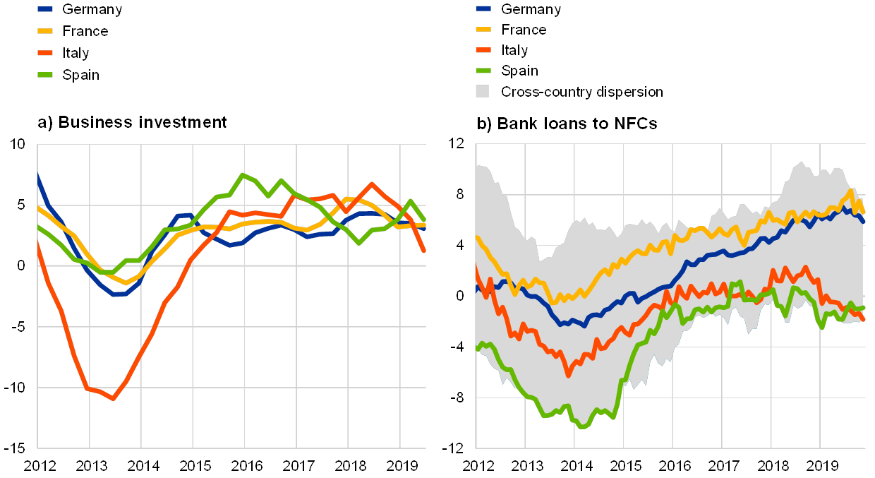 Notes: Business investment refers to private non-residential investment. Bank loans to NFCs are adjusted for sales, securitisation and cash pooling activities. The latest observations are for the second quarter of 2019 for business investment and November 2019 for loans.
