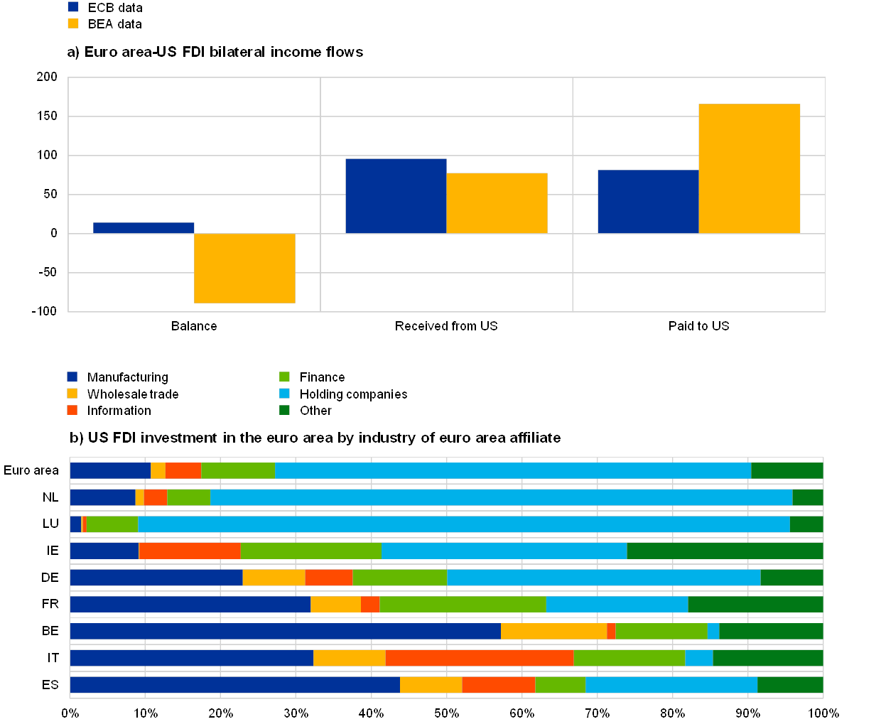 US MNEs often resort to complex chains of ownership – involving multiple FDI relationships in several euro area countries – which complicate the estimation of FDI income. According to BEA data (see panel (b) of Chart B), more than 60% of US FDI in the euro area is invested in holding companies, while only around 10% directly reaches euro area manufacturing entities. Holding companies – which are often SPEs – may serve as the first links between US MNEs and their euro area subsidiaries. Crucially, the income of these holding companies also includes the profits earned from other entities in MNE ownership chains (known as indirectly owned affiliates). [44] Recording such income – in particular for retained earnings – is challenging for statisticians because it requires comprehensive access to MNE balance sheets and their ownership links. Differences in the information available on US MNEs may partly explain why FDI income paid to US investors is lower in European statistics compared to US statistics.