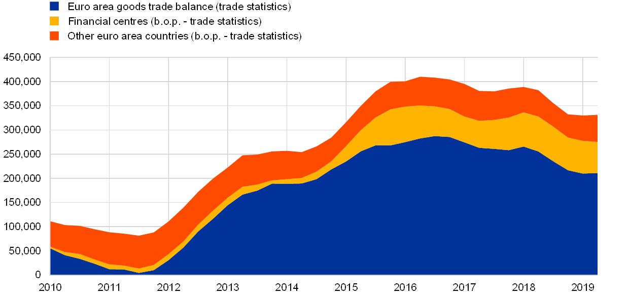 Notes: The blue area is the net exports of the euro area as recorded in national trade statistics. The yellow and the orange areas depict the difference between b.o.p. and trade statistics in financial centres and other euro area economies, respectively. The group of financial centres includes Ireland, Belgium, Luxembourg, the Netherlands, Malta and Cyprus. This chart is based on quarterly data. The last available observation is from the second quarter of 2019.