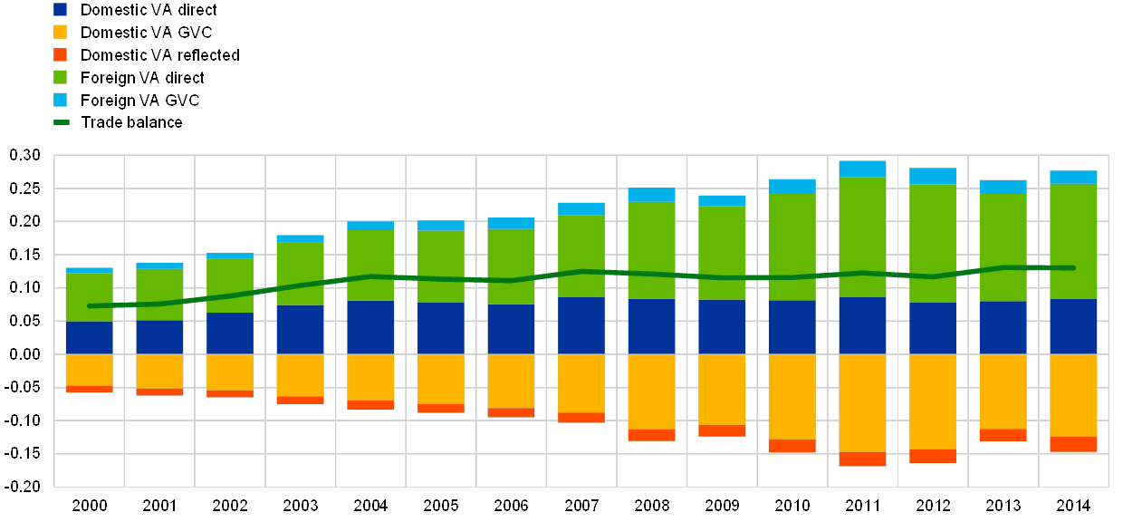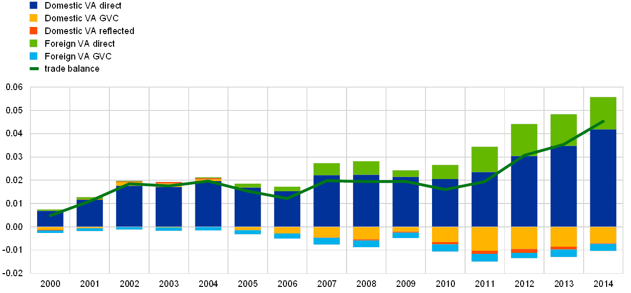 35. The evidence presented in this box is based on the World Input-Output Database (WIOD) that employs b.o.p. statistics as an underlying source. The decomposition follows the methodology used in Borin, A. and Mancini, M., “Follow the value added: bilateral gross export accounting”, Temi di discussione (Economic working papers), No 1026, Bank of Italy, July 2015. The exercise focuses on four main components of the trade balance: i) the domestic value added absorbed by the direct importer (DVA direct); ii) the domestic value added exported and further re-exported as foreign value added in the GVC chain (DVA GVC); iii) foreign value added exported directly to the final consumer country (FVA direct); iv) foreign value added that is further exported by third countries in the GVC (FVA GVC), which only indirectly reaches the final absorbing economy. The trade balance of domestic value added exported abroad is a residual category, which is reflected and absorbed at home (DVA reflected).