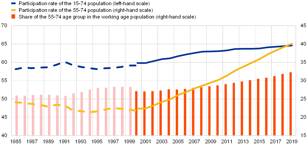 8. The labour force of older workers has also increased in the United States (driven by demographic developments) while the participation rate of the older age group has been relatively stable, following a rise until 2008. In Japan, the labour force of those above the age of 55 has also been increasing. This reflects both the rising population of this age group and the rise of the labour force participation rate. In 2019 the labour force participation rate of the 55-64 age group was 65% in the United States and 78% in Japan, which compares to 63.6% in the euro area. Source: Eurostat, Haver, U.S. Bureau of Labor Statistics.