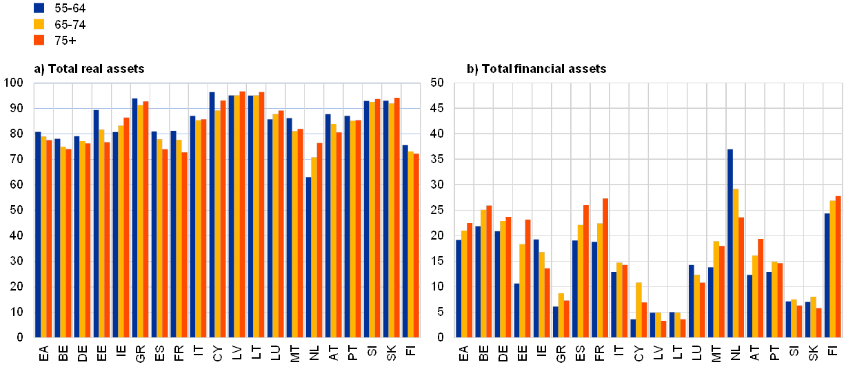 The composition of household net wealth also varies significantly as a function of the household age according to survey data.[27] Regarding housing wealth, Chart B shows that households tend to disinvest at 75 years and above (left). By contrast, the picture for financial wealth (right) indicates the opposite trend, with older households continuing to accumulate financial assets into old age. The main exceptions are Ireland and the Netherlands where households invest more in real assets when ageing.