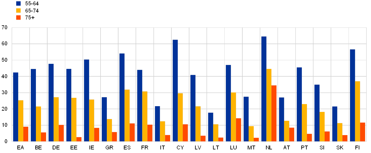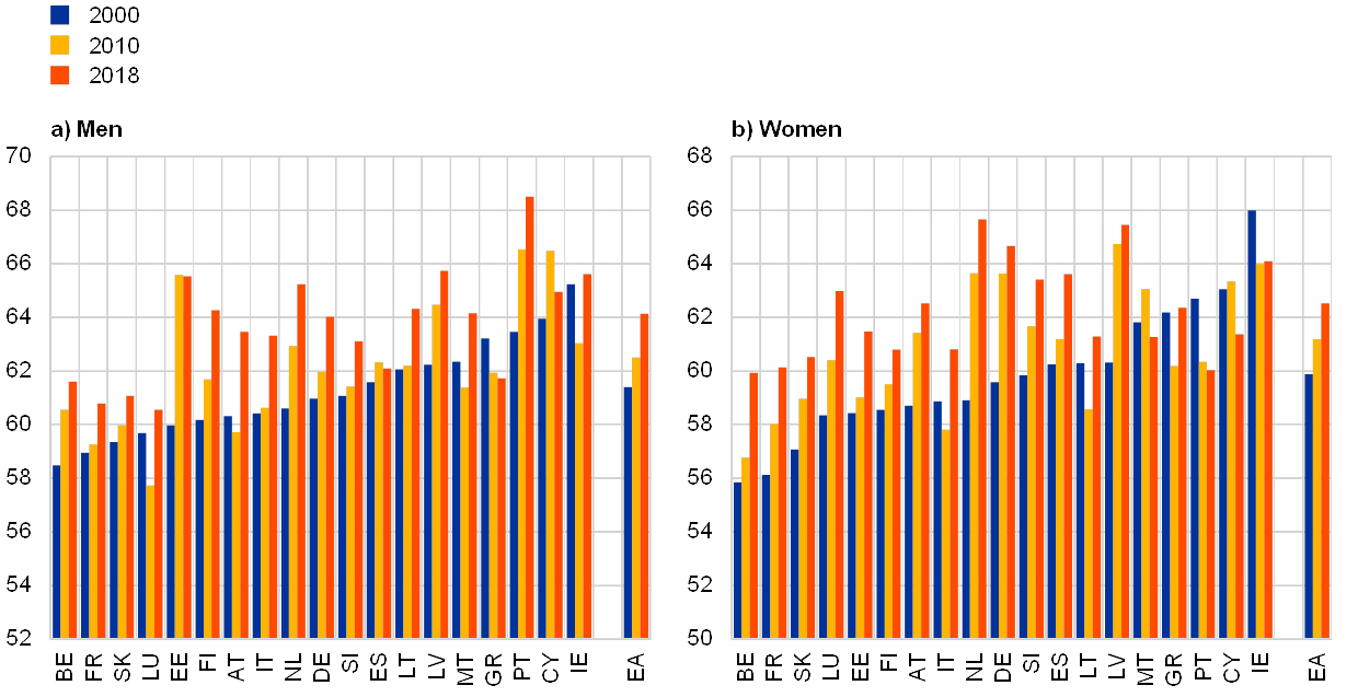 The rise of labour force participation rate of older workers is more pronounced for women. In the euro area, the recent increase in the female participation rate in the 55-74 age group (19 percentage points) exceeded that of men (15 percentage points). Still, women in this age group continue to participate in the labour market less than men (Chart 2). This is true for all euro area countries. Between 2000 and 2019, the difference between the increase in the male participation rate and the female participation rate was particularly pronounced in Latvia, Estonia, Ireland, Slovakia, Cyprus and Spain.
