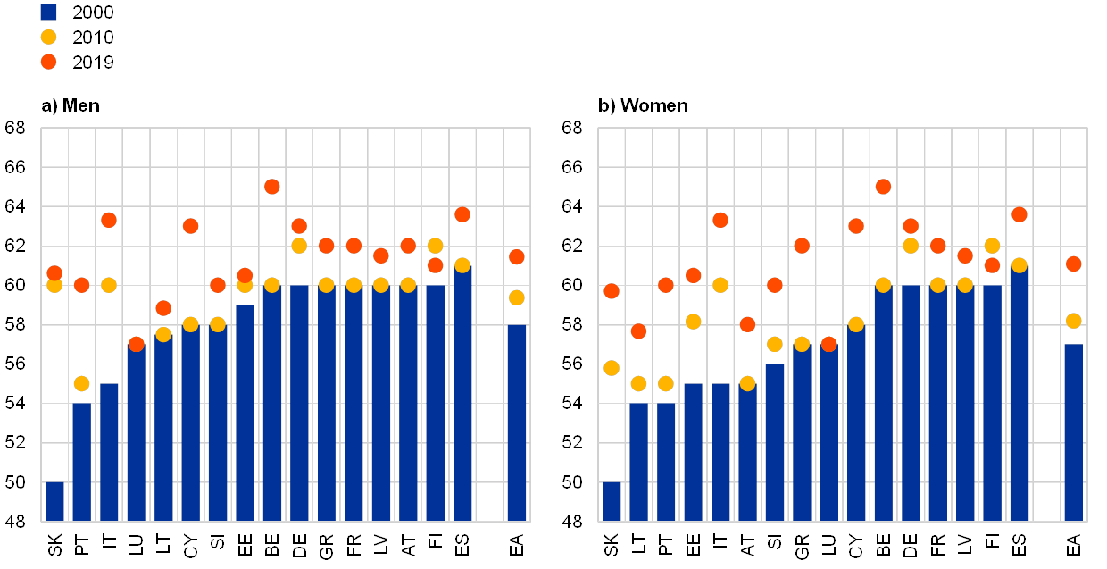Stricter eligibility criteria for statutory pensions were often complemented by restrictions on early retirement. All euro area countries, except Ireland and the Netherlands, have early retirement schemes in place.[31] Some countries even operate several early retirement schemes in parallel which target specific groups of workers. Most early retirement schemes entail deductions to allow for more actuarial fairness. Since 2000, the early retirement age limit was raised on average by 3 ½ years for men and by more than 4 years for women, reaching around 61 years for both men and women in 2019 (Chart 9). Some countries, mainly those that implemented an automatic link between retirement age and changes in life expectancy, also broadened this instrument to their early retirement schemes. In addition, six euro area countries (Belgium, Germany, Greece, Spain, France and Austria) allow receipt of full pension without any deductions before reaching the statutory retirement age. However, entitlements are usually made conditional on specific criteria, such as long working careers. Since 2000, these requirements were significantly increased to currently around 40 contributory years or more. By requiring very long working careers, such early retirement schemes have implicitly become predominantly tailored towards workers with earlier career starts and lower educational levels.