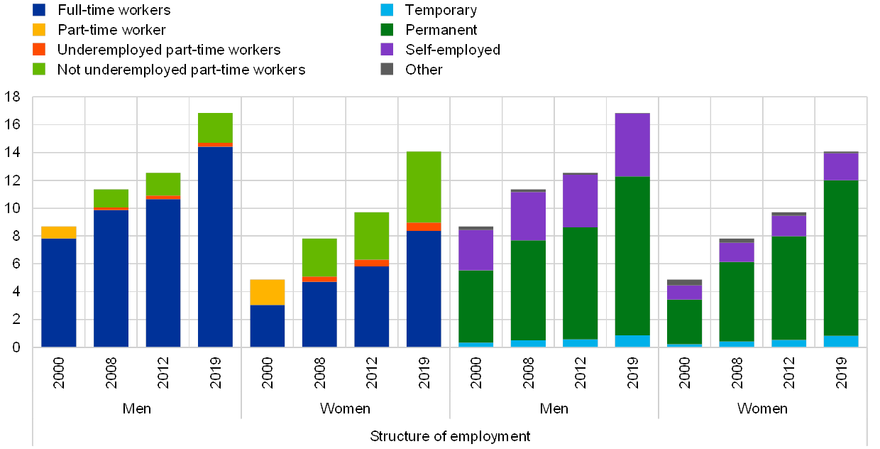 Notes: In the European Union Labour Force Survey, it is possible to distinguish between part-time workers who are seeking to work more hours and those who are not. The former group is referred to as “underemployed” and the latter is referred to as “not underemployed”. The decomposition of part-time workers according to underemployed and not underemployed is not available for the period before 2008. Disaggregation of employment is available either by full-time/part-time or by permanent/temporary, but not in combination.