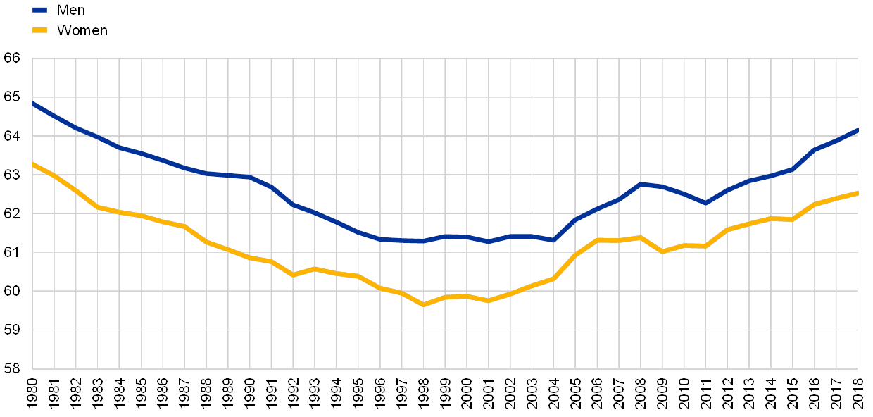 Healthy ageing is likely to encourage longer working lives. Healthy ageing not only implies an increase in life expectancy, but also better health conditions of older cohorts, both reflecting long-term trends. Since 2000, life expectancy at age 65 in the euro area increased on average by 2 ½ years, reaching almost 21 years in 2018, with a stronger improvement for men compared to women.[12] The number of healthy years expected at older ages has also improved in many countries. Several factors might have positively affected the health of individuals, and a person’s health is an important prerequisite for older workers to stay longer in the labour force. Healthy ageing might be positively influenced by higher educational levels, as life expectancy is found to be higher for people with higher education.[13]
