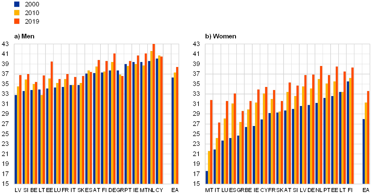 Analogous developments were observed for the duration of working careers, in particular among women. The length of working careers is another indicator for the actual retirement age. Since 2000, the duration of working life increased for men by 2 years and for women by almost 6 years, standing at almost 39 years and 33 ½ years in 2019, respectively (Charts 7). This has to be seen in the context of rising education levels, particularly for women. Women work longest in Estonia, Lithuania, the Netherlands and Finland, while the most substantial improvements since 2000 were achieved in Spain, Luxembourg and Malta. Overall, the rising duration of working careers seem to broadly coincide with the sharp rise of the participation rate of older workers.