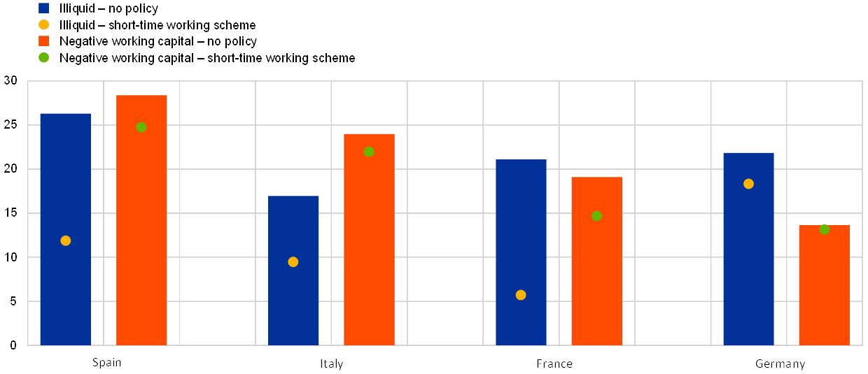 30. If the analysis also took into account corporations with no employees and sole traders, the share of firms at risk of illiquidity would go up in all countries by about 5 percentage points. If the original analysis included firms that were illiquid at the start of the crisis, the share of illiquid firms at its peak could double in all countries.