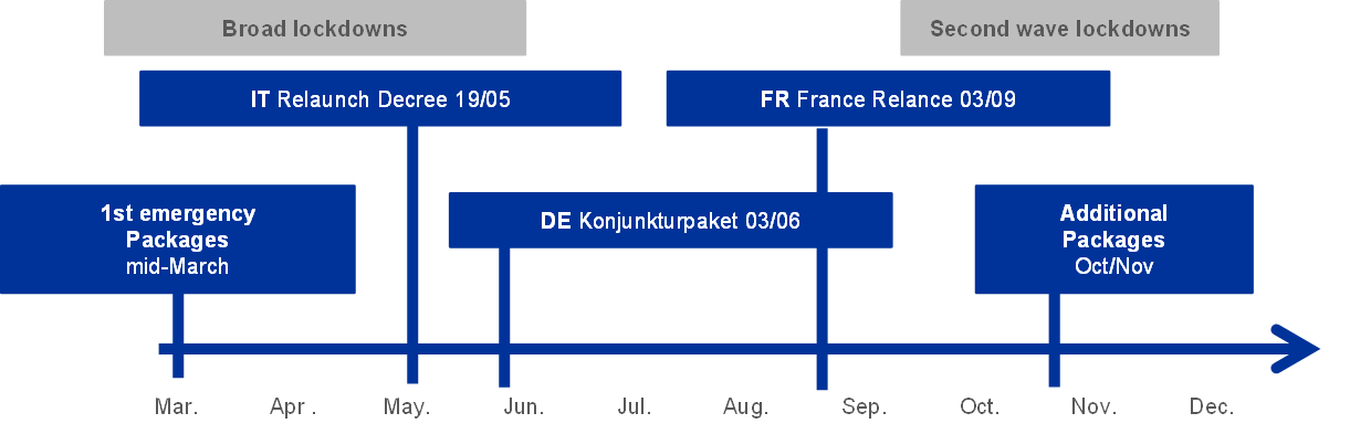Fiscal measures were implemented via sequences of fiscal packages that reflected the change in priorities over the course of 2020. The four largest Member States, namely Germany, France, Italy and Spain, implemented their first emergency packages as of mid-March, a few days after the introduction of the first broad lockdown measures in Italy (see Figure 1). These packages aimed to address the health crisis and to support the sectors most hit by lockdown measures. They were relatively similar across countries. Later, some of the countries announced further fiscal packages to extend the liquidity and emergency measures included in the first package. Following the end of the broad lockdowns in the summer, Member States progressively announced further packages, which were typically more concerned with supporting the recovery and had a longer-range focus, including measures that would come into effect in 2021 and beyond. Most notably, in June Germany announced its “Konjunktur- und Zukunftspaket” with measures amounting to €130 billion (i.e. 3.9% of GDP) and in September France launched its “France Relance” package comprising measures worth €100 billion, (i.e. 4.4% of GDP). Later, around mid-October, several other Member States announced in their draft budgetary plans for 2021 additional measures for 2021 and subsequent years. Overall, the timing of the recovery packages is much more heterogeneous than that of the emergency measures taken in the spring. Finally, at the end of October 2020 several Member States reacted quickly to the second wave of the pandemic and announced additional emergency measures specifically targeting firms affected by the new partial lockdowns.