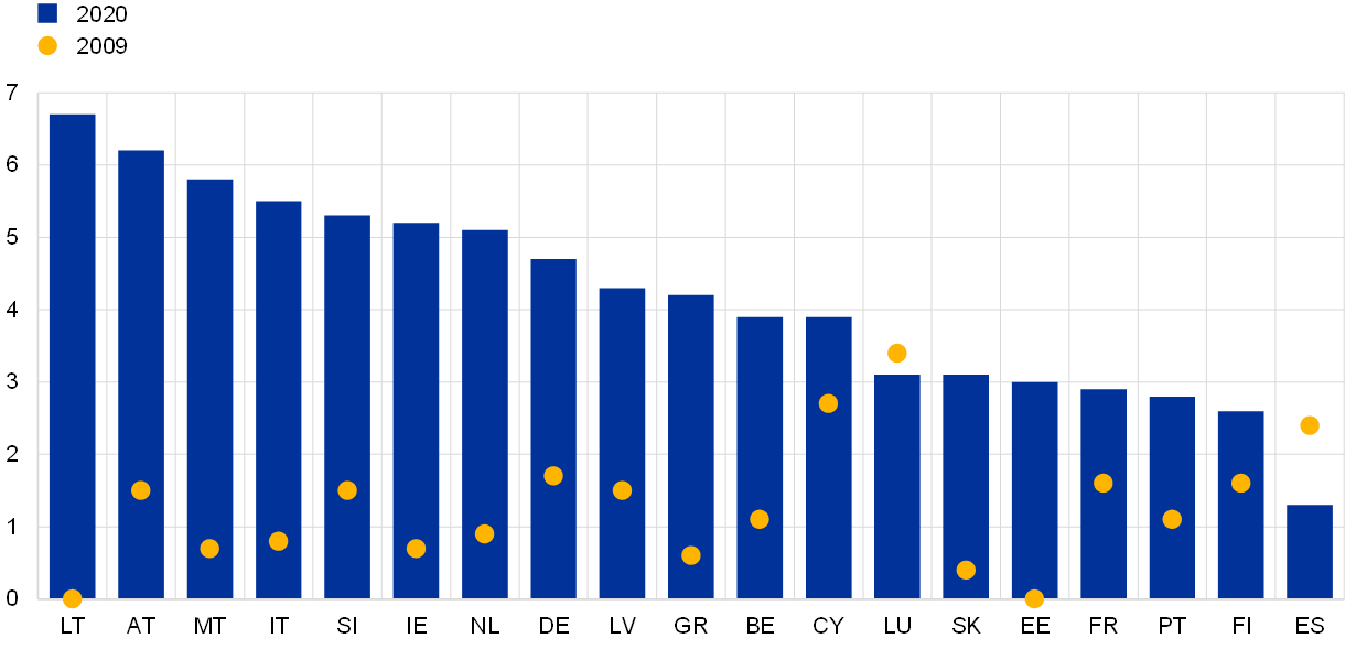During the lockdowns, the liquidity position of firms was further enhanced by various tax-related measures, in particular tax deferrals, which are not expected to have a substantial impact on the budget balance of 2020. Very early on in the pandemic, all euro areas countries took measures to relieve the immediate tax payments of firms severely affected by the lockdowns. Typically, such measures did not reduce the overall tax obligations of firms but shifted the payment dates from the time of the broad lockdowns in the first half of the year to later dates, thus providing additional liquidity to firms. These measures comprised tax deferrals (covering VAT, corporate and personal income taxes, and social contributions), reductions in corporate tax prepayments (as the calculation of the current year’s corporate tax payments is mostly based on last year’s outcome) and speeding up of tax refunds and arrears or the suspension of enforcement measures. In most countries, the amounts of deferred taxes amounted to between 0.5% and 2% of GDP and in several cases were very substantial, reaching close to 8% of GDP in the case of Luxembourg, according to the country’s DBP for 2021. However, the overall effect of these measures on the budget balance in 2020 is relatively small for two reasons. First, in most countries the payment of the deferred taxes was due in the second half of that year. Second, even if payment is deferred to the following years, the expected revenue is accrued to the year in which the tax liability arose.