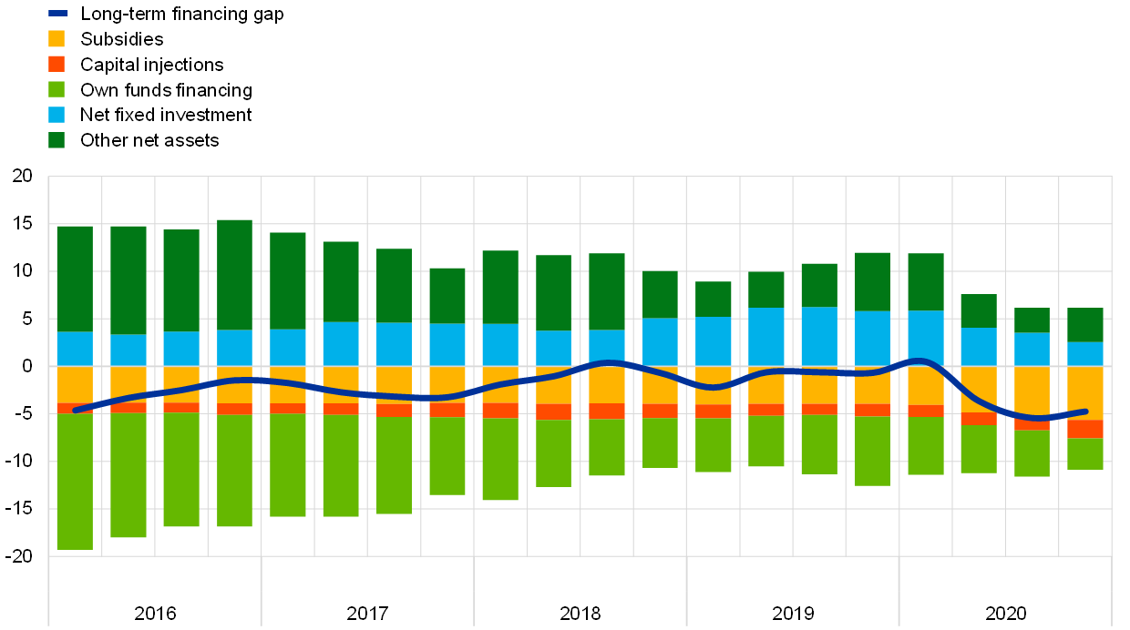 The government interventions can be seen in the increase in the contribution of subsidies and capital injections to overall resources in 2020. In Chart 2, the resources from government support are broken down into two categories, “subsidies”, which include current transfers and salary support measures,[17] and “capital injections”, including both capital transfers and equity acquisitions by government.[18] The relative weight of subsidies and capital injections has been high since end-2017, mainly due to a general decline in private own funds financing (particularly due to a lower raising of equity compared with previous periods, also reflecting a preference for bond issuance). The year 2020 saw an acceleration in this trend, with subsidies and capital injections on the rise, while private own funds financing continued to be subdued. The latter mainly reflected a decline in operating surpluses before subsidies (down by 1.4 percentage points on value added from end-2019, four-quarter sums).