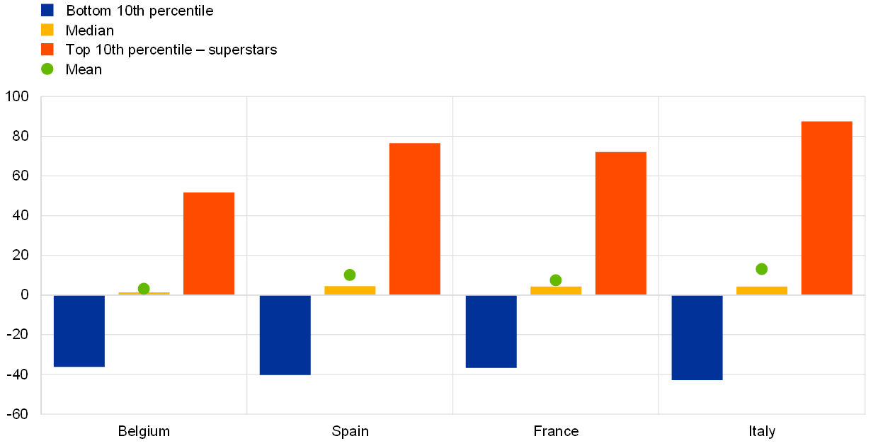 The process of creative destruction whereby new firms replace obsolete ones contributes to the reallocation of resources across firms, albeit to a small extent in the short term. The limited short-term contribution of firm demography is the result of two counterbalancing effects. Data on four euro area countries show that, on the one hand, the very low productivity of exiting firms relative to other firms in their market increases the productivity contribution of firm exit. On the other hand, new firms start up with relatively low productivity levels, which acts as a drag on productivity growth (Chart 7 – top panel).[33] The net contribution of entry and exit is, in consequence, positive overall but relatively small over the short term across all countries.