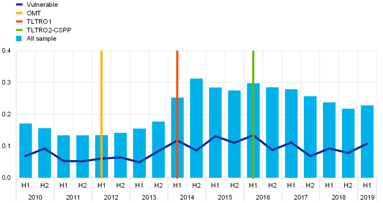 Notes: Enterprises that had applied for bank loans. Vulnerable firms are firms that have reported simultaneously lower turnover, decreasing profits, higher interest expenses and higher or unchanged debt to total assets in the last 6 months OMT: outright monetary transactions programme; TLTRO: targeted longer-term refinancing operations; CSPP: corporate sector purchase programme The first vertical line denotes the announcement of the OMT; the second vertical line denotes the start of TLTRO I and the negative rate policy; and the third vertical line denotes the start of TLTRO II and the CSPP. Figures refer to rounds 3 (March-September 2010) to 22 (October 2019-March 2020) of the survey.