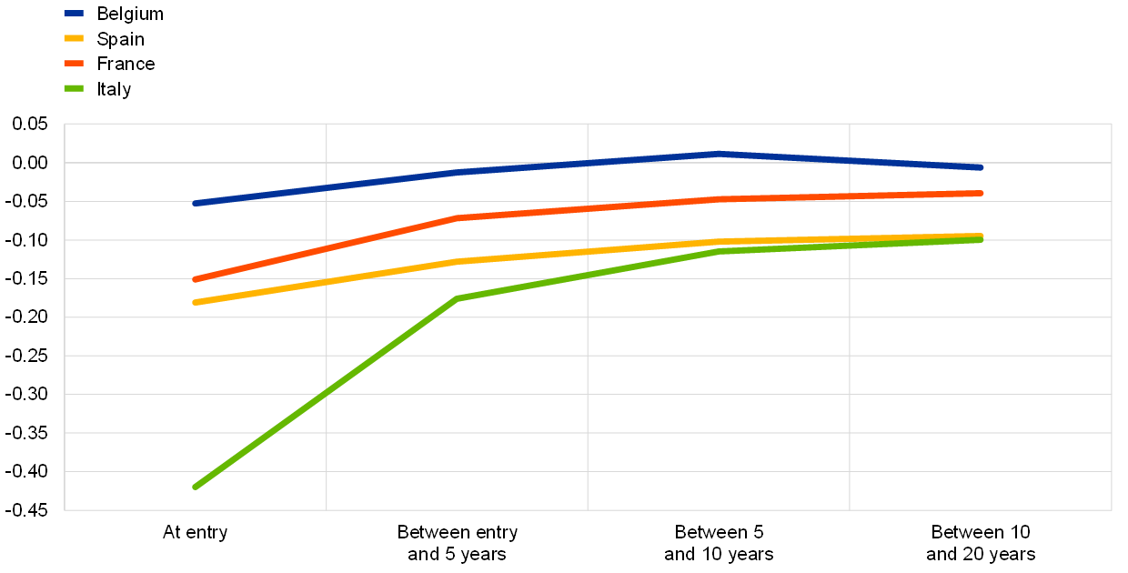 If they survive, new firms converge to the average scale of efficiency in the sector. This implies that these firms grow faster in terms of productivity than incumbents in the same sector, particularly during their first five years of activity. This is known as the “learning effect”. After controlling for the country and sector of activity, sector demand conditions and entry year, it is found that young surviving firms in Belgium and France converge in about ten years to the productivity level of mature incumbent firms with more than 20 years of activity in the same sector. In Italy and Spain, where new firms’ productivity level is well below that of incumbents, the catch-up process takes longer (Chart 8 – top panel).