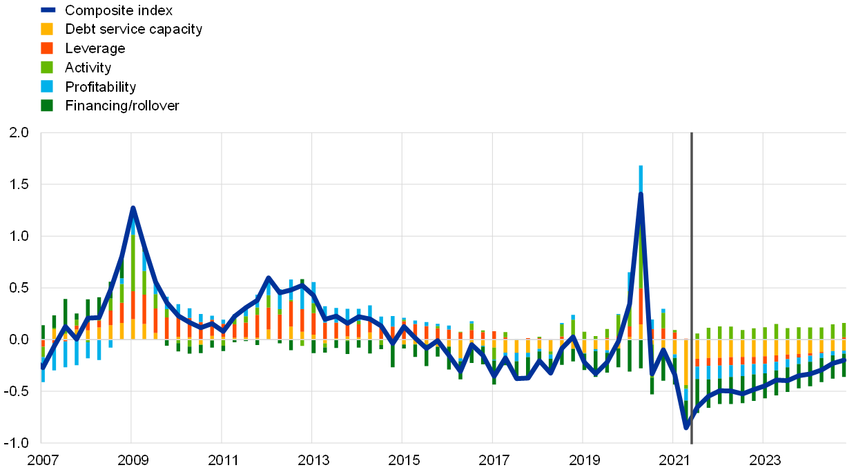 Notes: Positive values indicate higher vulnerability, negative values indicate lower vulnerability. The latest observations are for the second quarter of 2021. ECB staff estimates from the third quarter of 2021 to the fourth quarter of 2024.