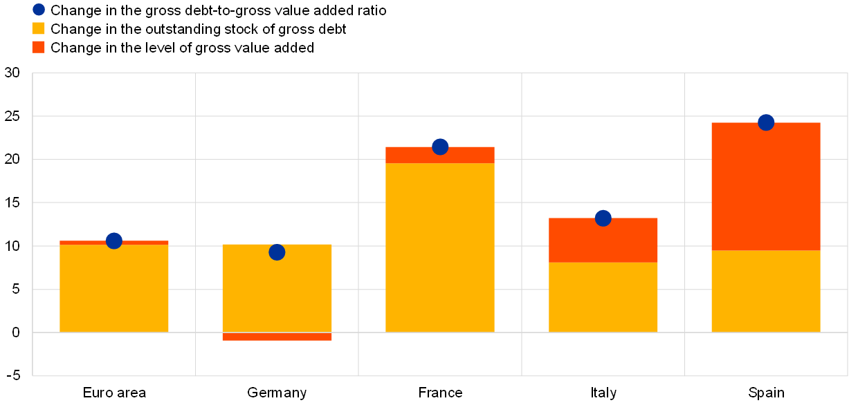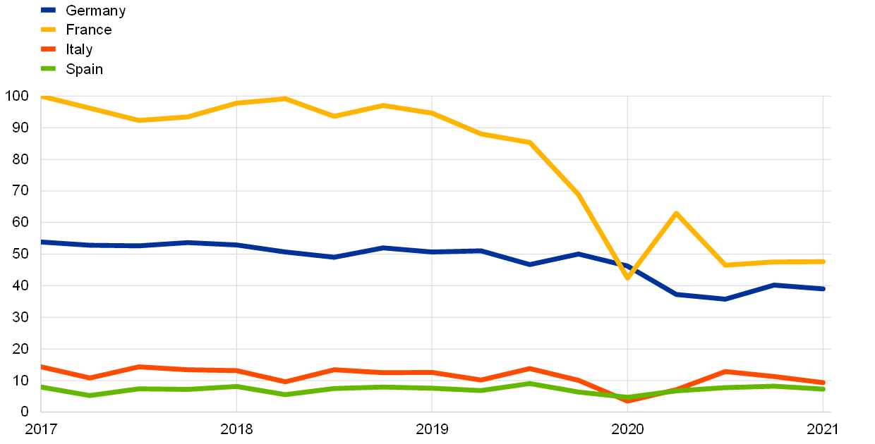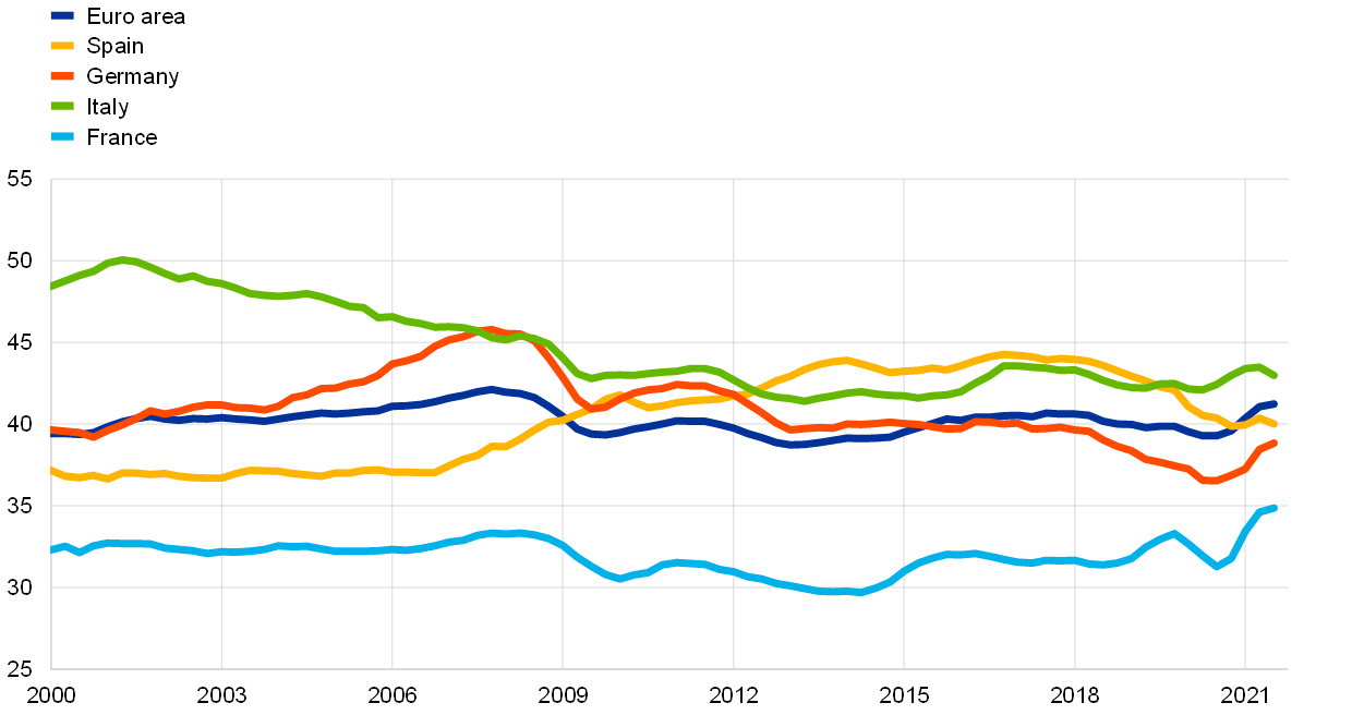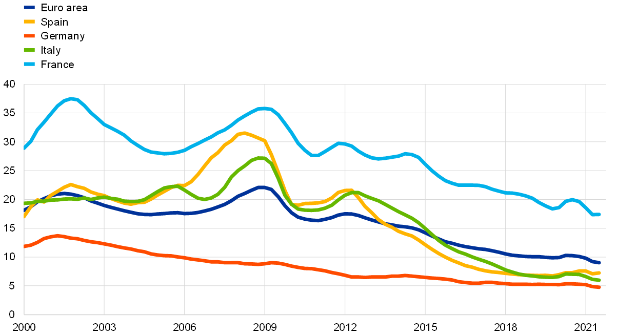 Despite the increase in gross indebtedness, the debt service burden has continued to decline to new record lows. Gross interest payments by firms in the large euro area countries have decreased by between 1.8% and 9.1% since the end of 2019, despite the increase in the level of debt. This decline reflects the favourable financing conditions promoted by the policy response to the crisis, which have alleviated corporate debt sustainability concerns and supported the recovery. However, debt servicing costs as a percentage of profits continue to vary significantly across countries (Chart 5, panel a). This mainly reflects differences in gross debt levels and sectoral compositions across countries, the latter of which affects the gross operating surplus-to-value added ratio (Chart 5, panel b).[5]