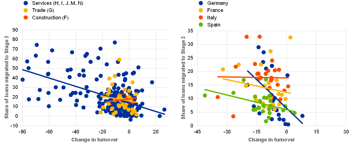 Sectoral shocks arising from business closures and restrictions on economic activity also contributed to weaker corporate asset quality (Chart B, panel a). Firms operating in sectors most affected by the lockdowns were more likely to see their loans reclassified to Stage 2 or 3, although the noisiness of the relationship between sectoral turnover shocks and loan migrations suggests that other factors were significant too. This relationship is particularly strong in the services sector and much weaker in the construction sector, while manufacturing displays heterogeneous behaviours across countries.