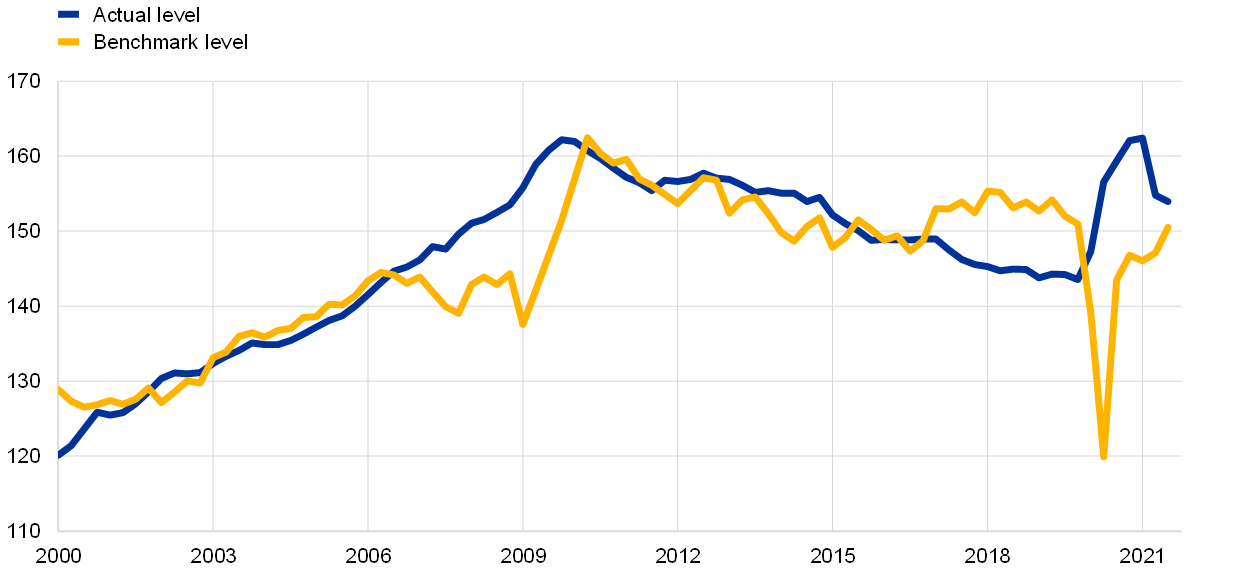 Notes: Consolidated gross debt is the sum of loans to NFCs, debt securities issued and pension liabilities minus intra-sectoral lending (all notional stocks). Benchmark levels are estimates based on an error correction model relating NFC consolidated gross debt to NFC output, the relative cost of debt financing and the term spread (i.e. the difference between the euro area ten-year government bond yield and the euro area three-month money market rate). The relative cost of debt financing is defined as the composite cost of debt minus the cost of equity financing. The estimation period is from the first quarter of 1999 to the fourth quarter of 2019. The latest observations are for the third quarter of 2021.