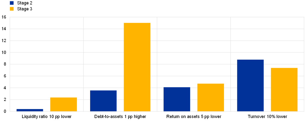 Results from regression analysis confirm that prior fundamentals and sectoral shocks explain the observed asset quality deterioration. A multinomial logit model is used to assess the role of several factors in driving the deterioration in corporate credit quality. The dependent variable is defined as the IFRS 9 stage in which the firm’s loans were classified at the end of 2020, while three groups of explanatory variables are considered: firm-level financial variables, representing the pre-pandemic fundamentals of the borrower; macro variables, representing the country and sector-specific impact of the pandemic; and bank-specific factors. Firms’ profitability and leverage played a particularly important role: a 1 percentage point increase in the debt-to-assets ratio raised the odds of migration to Stage 2 by 3.6% for an average firm, and a 5 percentage point decrease in return on assets increased these odds by over 4% (Chart B, panel b). Among the macro factors, sectoral cash flow changes show a strong negative relationship with migration to both Stage 2 and Stage 3.